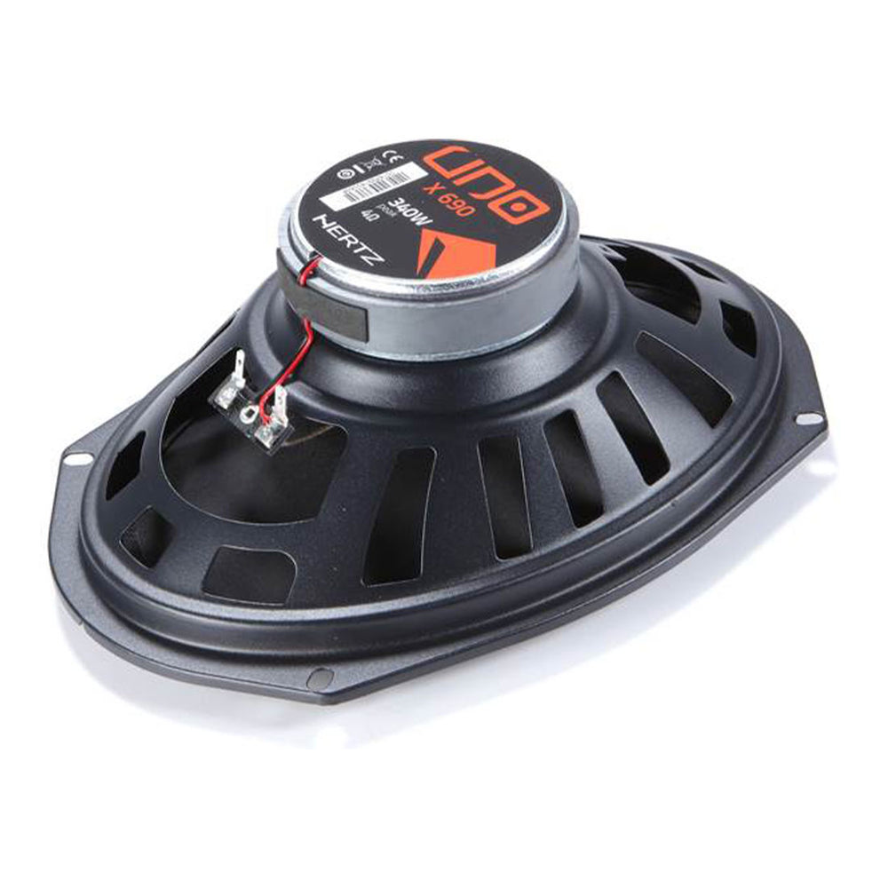Hertz X 690 Uno (6 x 9) mm (in.) | Coaxials | 340 W | 4 Ohm For our fans seeking strong emotions who have a 6”x9” OEM setup, Hertz offers the X 690, a 4 way monster with a power handling of 340 W. The double 15 mm piezoelectric super-tweeter with PEI dome extends the frequency response above 20 kHz, maximizing the stereo image.