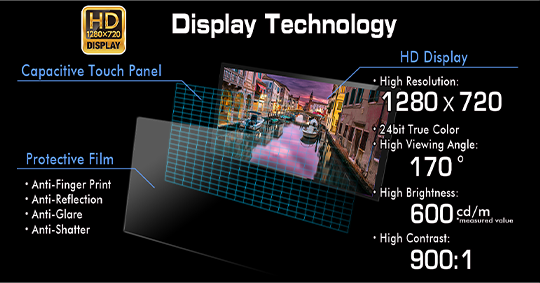 HD display delivers vivid colors with high-contrast and sharpness. Featuring an all-new electrostatic capacitive touch panel and HD LCD panel, with a high luminance white LED backlight.