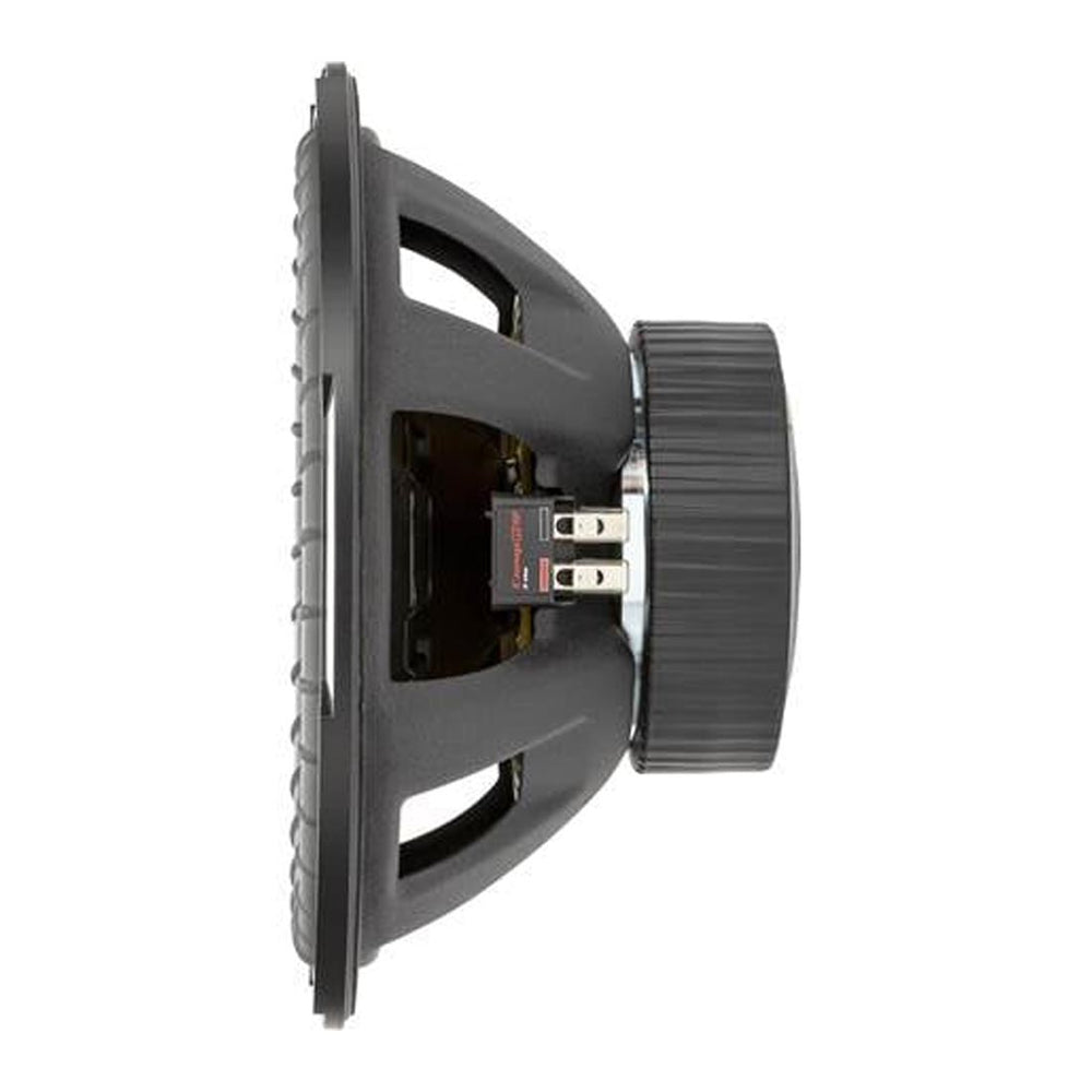 Featuring a 12-inch subwoofer with dual 2-ohm voice coils, the CompR subwoofer allows for easy optimization of your amplifier's power. Its injection-molded polypropylene cone ensures rigidity during intense play sessions, resulting in accurate and powerful bass reproduction. The double-stitched Santoprene rubber surround controls cone movement during vigorous workouts, maintaining precise sound quality.