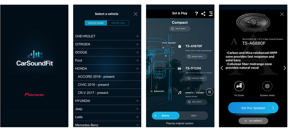 Pioneer’s CarSoundFit app is a car sound simulator for experiencing in-car sound with your own smartphone. Hear the difference between original car speakers and different Pioneer audio upgrades: convince yourself of the level of quality Pioneer can offer for your vehicle. For a virtual listening demonstration of these and many other Pioneer car speakers, download the free Pioneer CarSoundFit app on the Apple® App Store or Google Play Store.