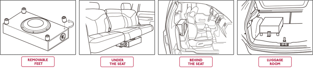 This subwoofer features a full grille and down-firing structure for cone protection and can be installed inside your vehicle's interior. This combines deep, powerful bass while seamlessly integrating physically, electrically, and more importantly improves the acoustics in the vehicle. This subwoofer was designed with the flexibility to be installed in three different ways. The provided feet can be screwed onto the bottom or top using the pre-drilled holes. Cushions on the feet prevent sliding.
