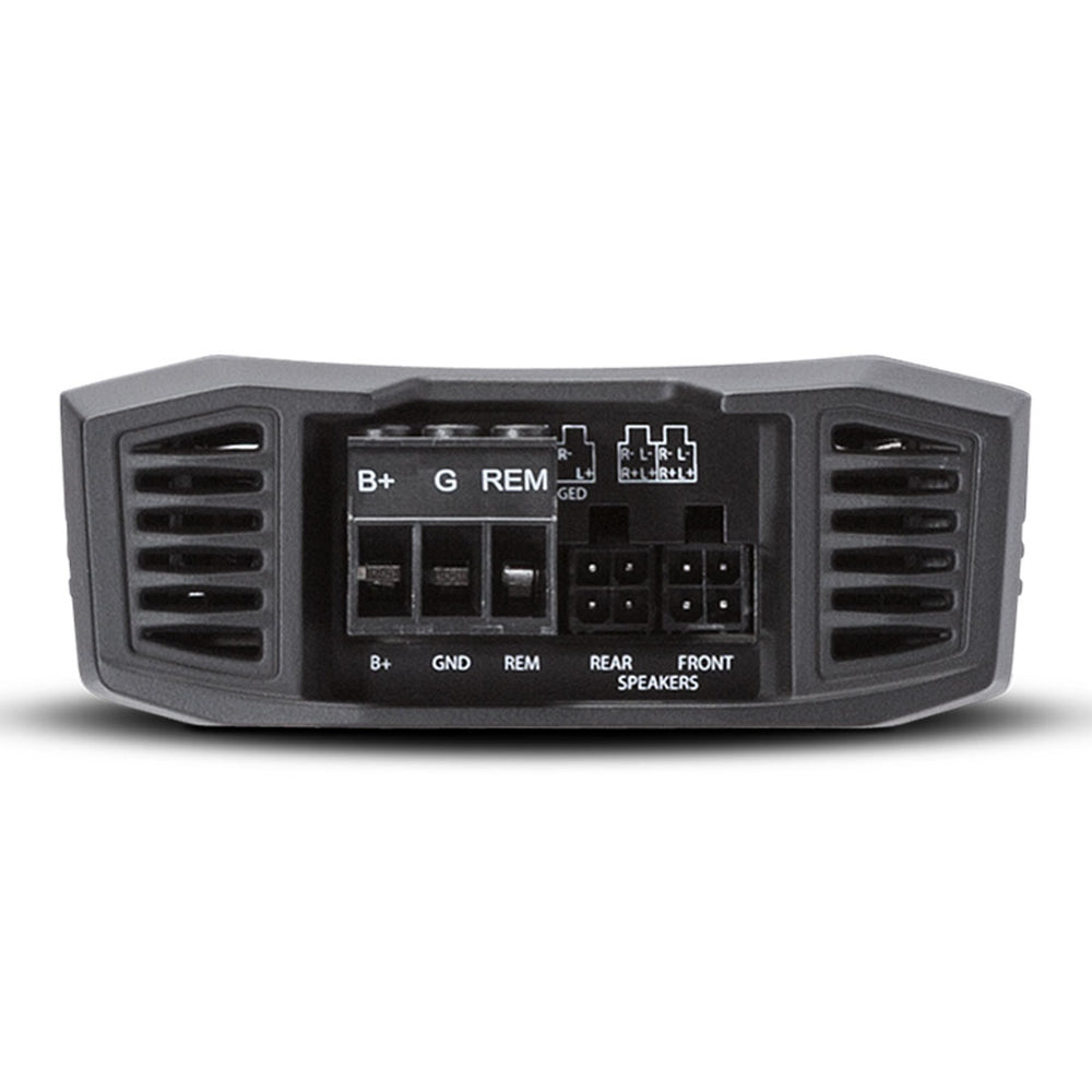 The Power T400X4AD is a 400 Watt 4-channel ultra-compact amplifier with high efficiency. Multi-impedance Constant Power, input/output clip detection, top-mounted controls, and dual fan forced induction cooling are just a few of the features. Perfect for small cars, trucks, motorcycles, and side-by-side UTVs that are hybrid or electric. Built on Rockford Fosgate's proprietary Class-AD technology, the Power T400X4AD 400 Watt 4-channel ultra-compact amplifier features Constant Power to produce the same output at both 4-Ohm and 2-Ohm impedances. Low-level and high-level inputs with auto turn-on enable flexible vehicle integration. Built-in crossover and C.L.E.A.N. input/output clip detection circuits are easily accessible via top-mounted controls. The 3-stage thermal lock extrusion with dual fan forced induction keeps everything cool, and the amplifier is protected by real-time thermal/protection schemes.