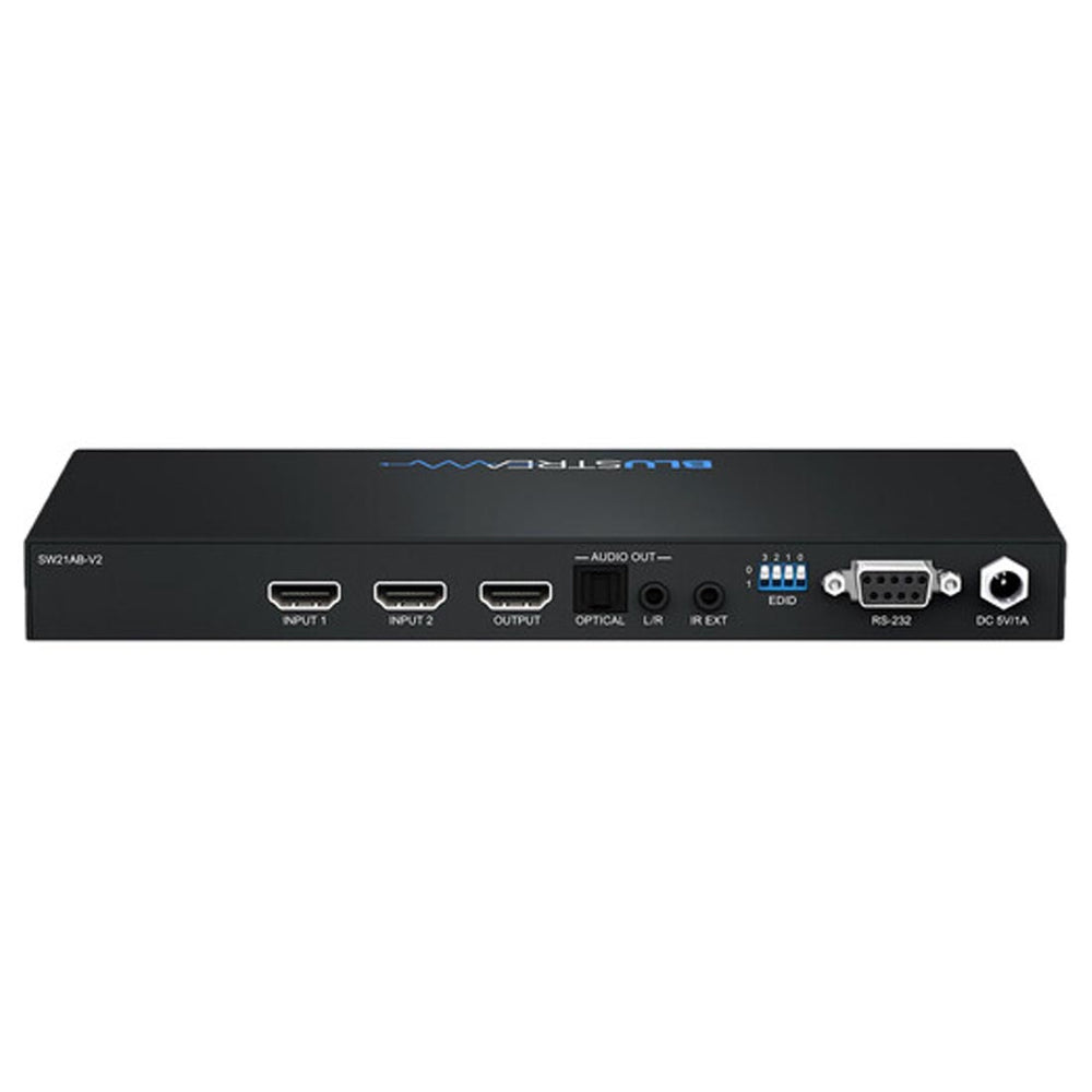 The Blustream SW21AB-V2 is a 2-way HDMI switch with integrated audio breakout that switches between two HDMI sources to a single HDMI output. It supports full HDMI 2.0 4K UHD (4K @ 60Hz 4:4:4) with HDCP 2.2 compliance and provides concurrent analogue L/R and optical digital audio outputs.