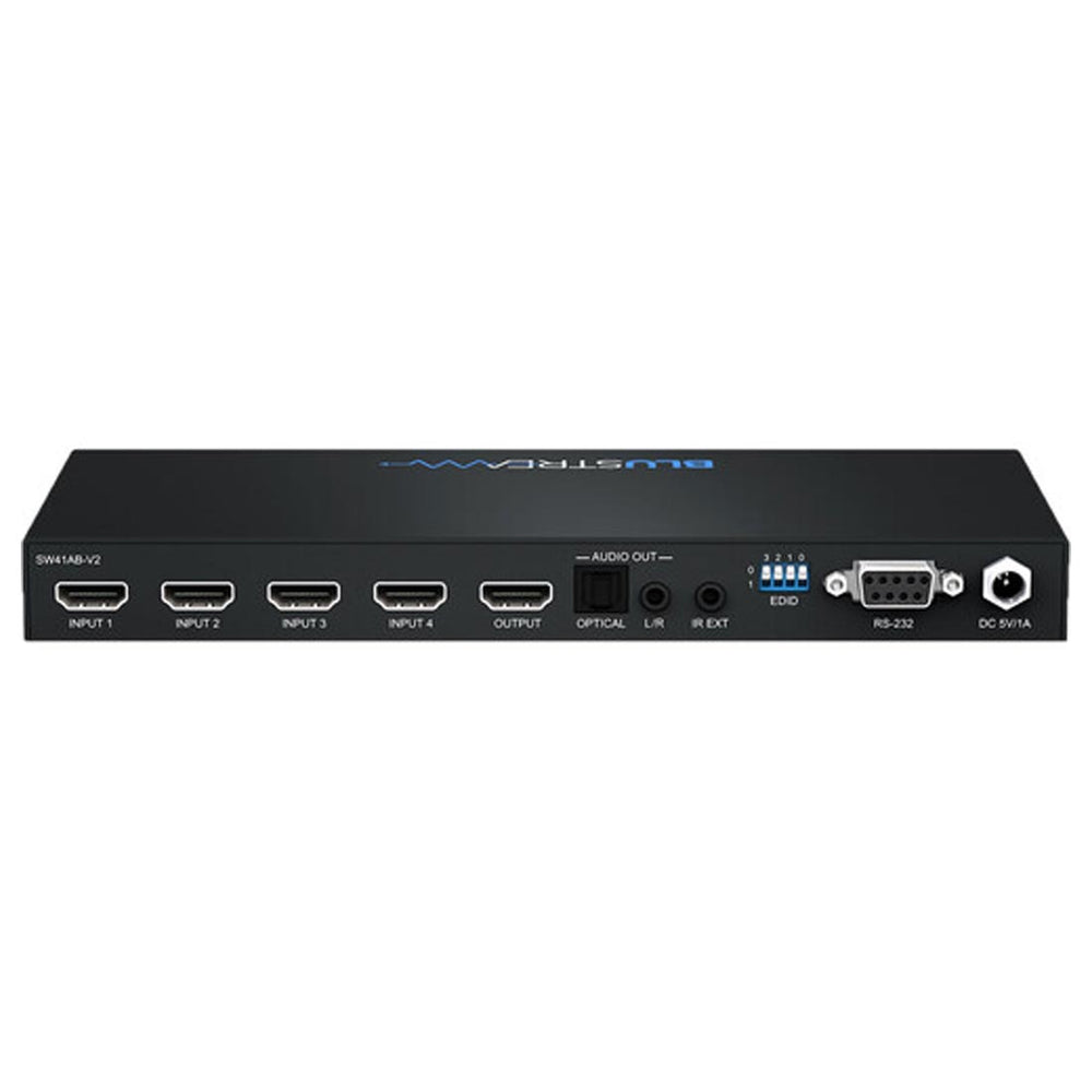 The Blustream SW41AB-V2 is a 4-way HDMI switch with integrated audio breakout and auto-switching, designed to route four HDMI sources to a single HDMI output. It supports full HDMI 2.0 with 4K @ 60Hz 4:4:4 and is HDCP 2.2 compliant.