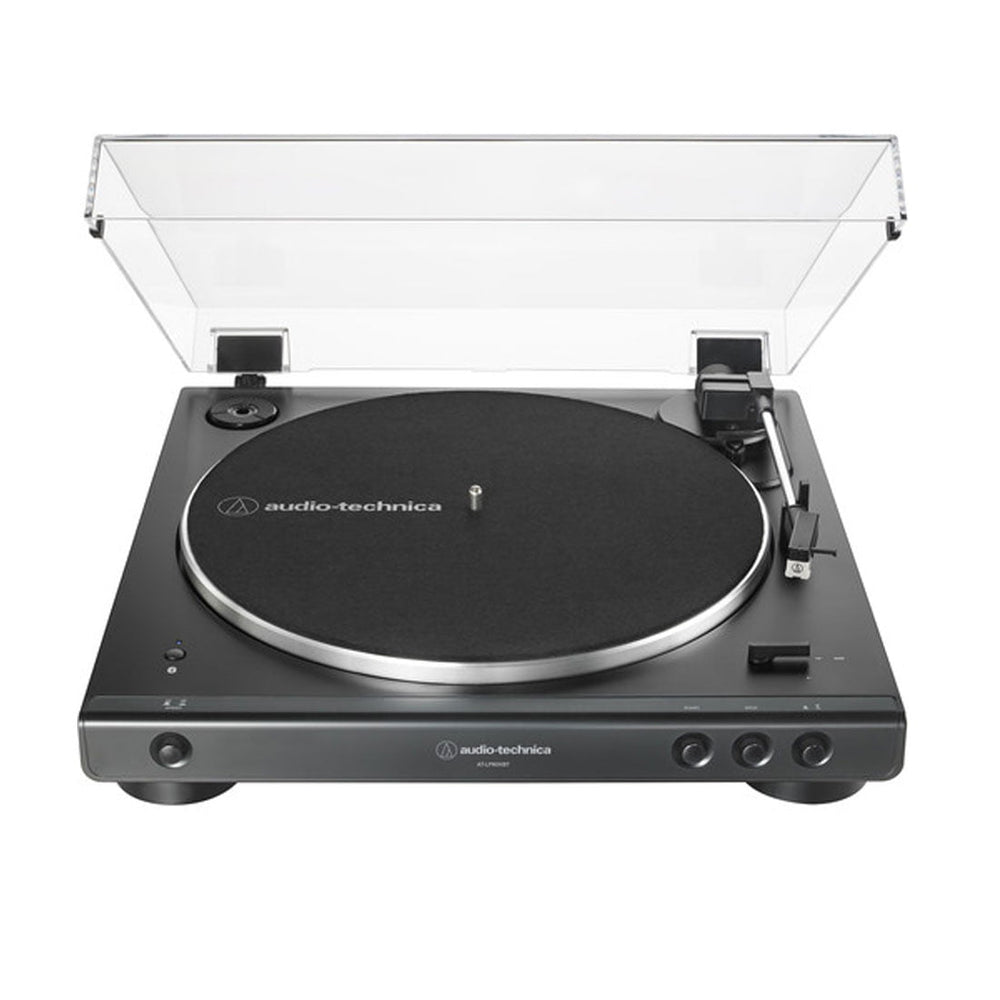 Audio-Technica AT-LP60XBT Stereo Turntable. It has a built-in switchable preamplifier, allowing you to connect directly to your stereo system or speakers of choice via RCA cables, also Bluetooth connectivity for connecting to your Bluetooth headphones or speakers. Includes a removable dust cover, RCA to 1/8" audio cable, and 45 rpm adapter.