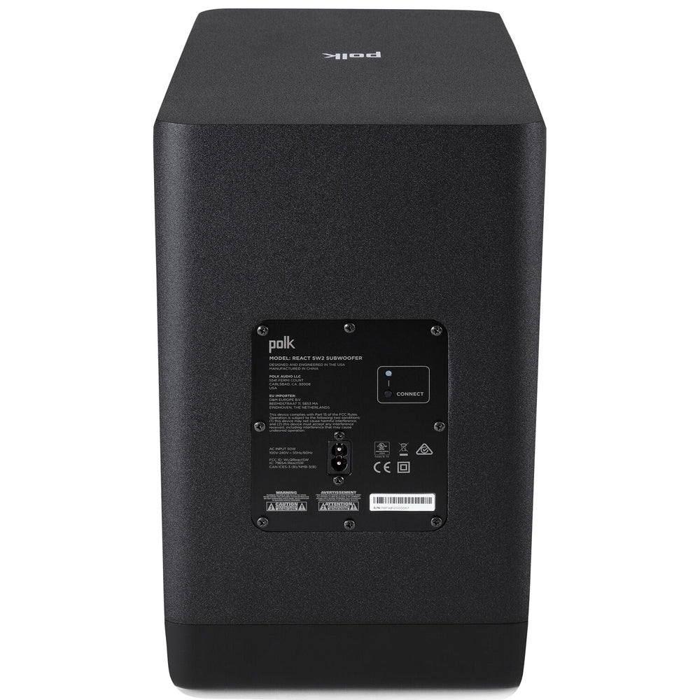Deep, impactful bass for your Polk React series sound bar. This seven-inch, long-throw, wireless subwoofer disappears in your room. Perfectly tuned to extend the bass of your React sound bar for virtually any movie, TV show, or song.