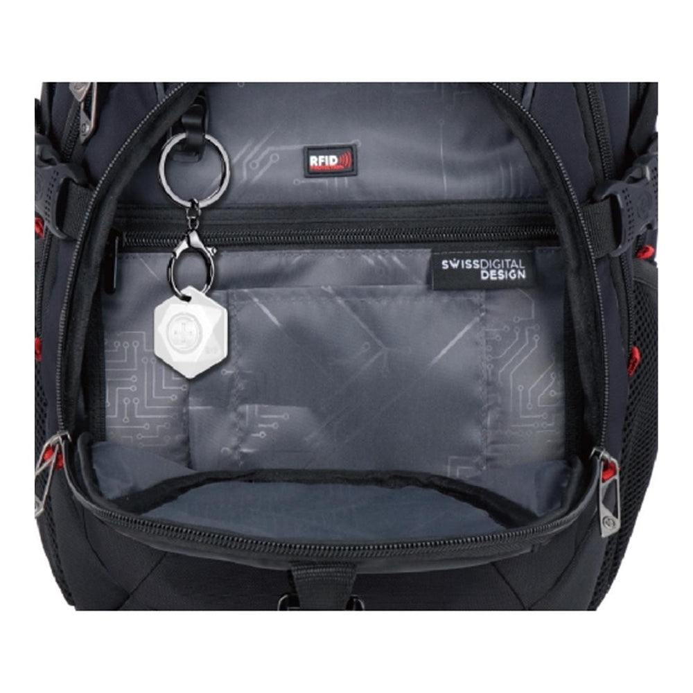 The Swiss Digital SD1694BT02506-01 Meilen is a travel-ready laptop backpack that secures a full-size 17" computer, keeps phones powered through a built-in USB port, and lets you locate the bag from your phone using the integrated SDD Finder. Designed for commuters, students, and frequent flyers, it combines organization, comfort, and smart security features in one streamlined pack.