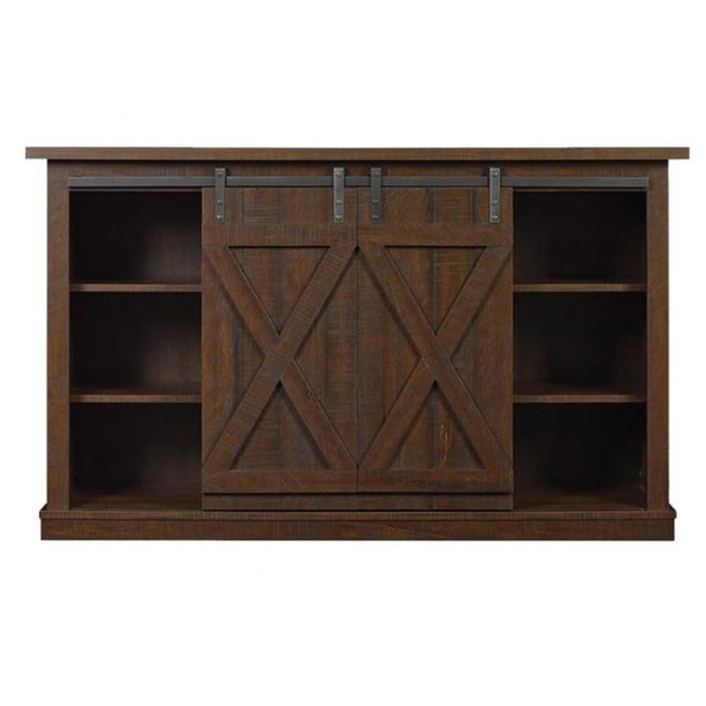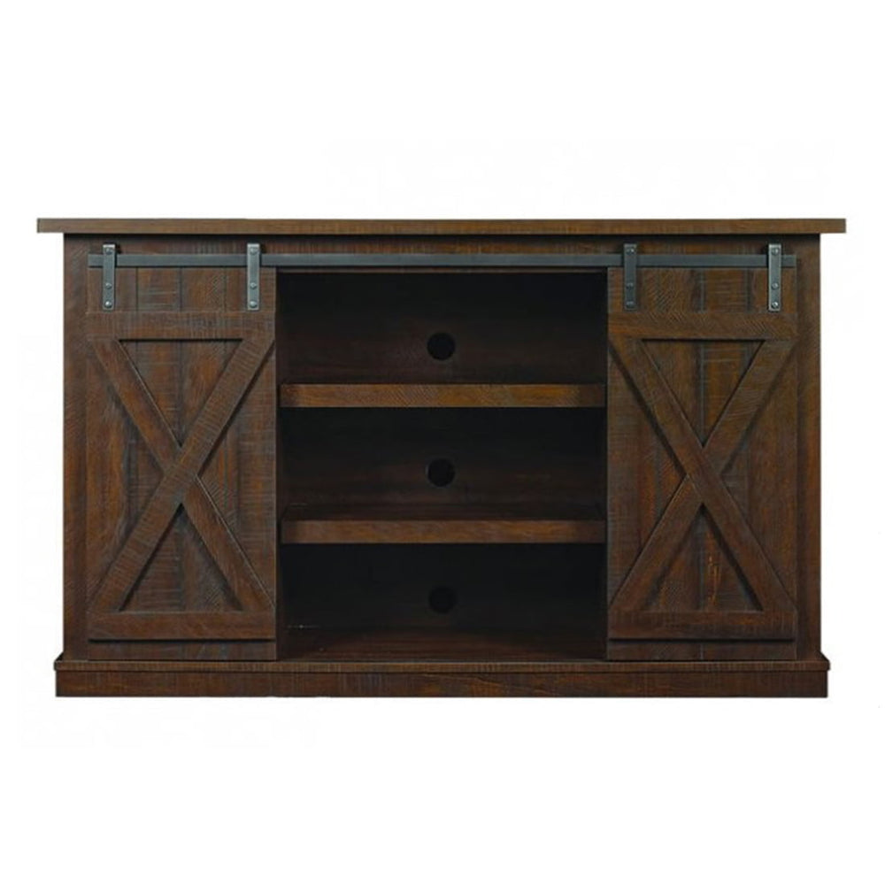 Entertain friends and family in your living or entertainment area and store everything you need in this Bell'O Harris Cottonwood TV Media Stand. Accommodating most flat screen TVs up to 60” or up to 75 lbs., this TV stand with Pewter metal hardware features barn style sliding doors, adjustable nine-shelf storage capacity and an integrated CMS® Cable Management System that hides unsightly wires and cables. Use this console in any room as a TV stand and a beautiful place to store A/V components, games or books. All hardware is included and it assembles easily for simple set-up and quick enjoyment. Tipping restraint hardware included to help prevent accidents and damage to the TV stand. A touch-up pen is included to keep your TV stand looking fresh and new.