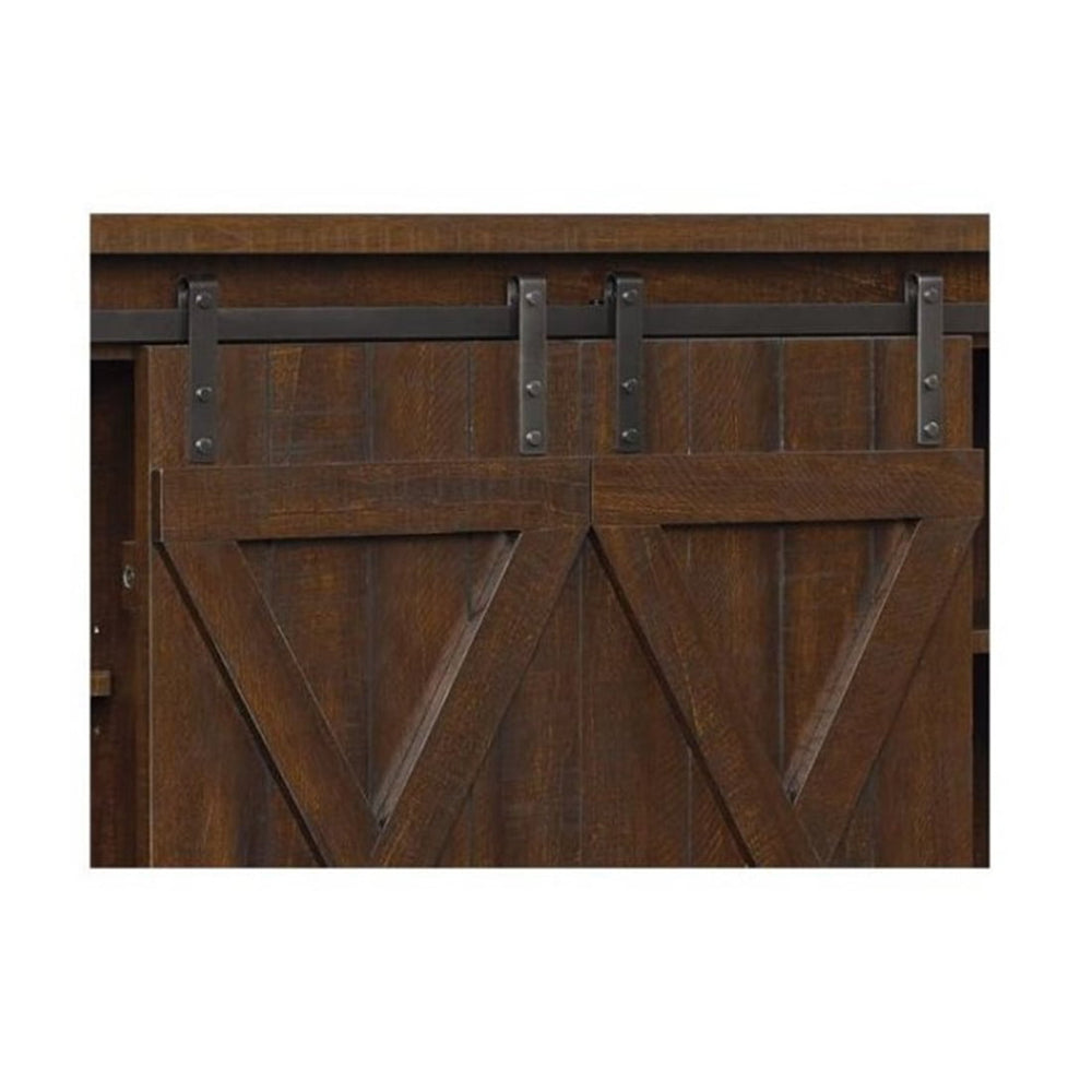 - Barn style doors suspended on a metal rail system slide to conceal a storage space to keep small items organized and out of sight