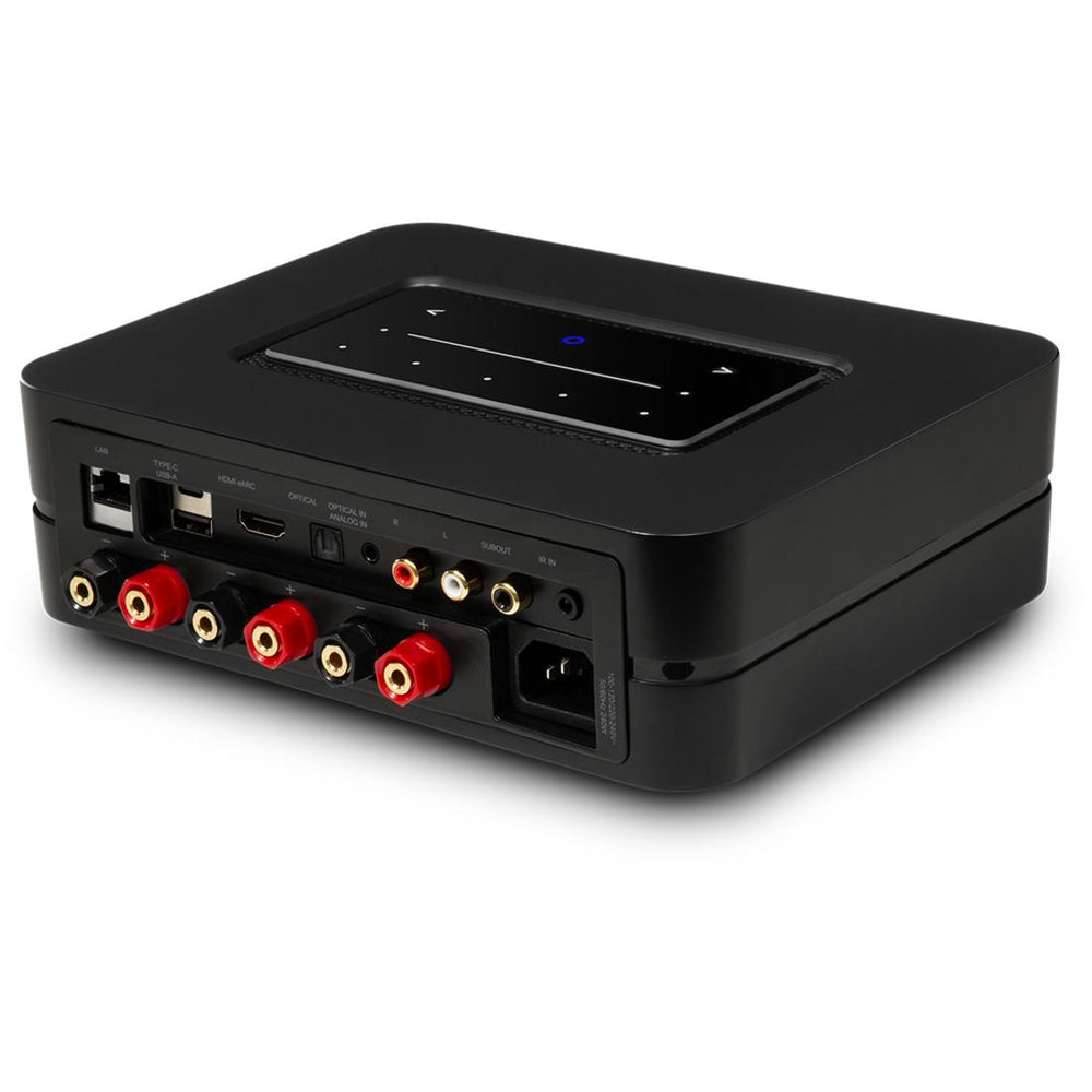 An HDMI eARC port lets the amplifier pull lossless audio directly from your television. Center-channel support and wireless Dolby Digital® surround pairing mean you can add Bluesound rear speakers and a PULSE SUB+ without running new wires. The result is simplified living-room wiring with immersive movie sound.