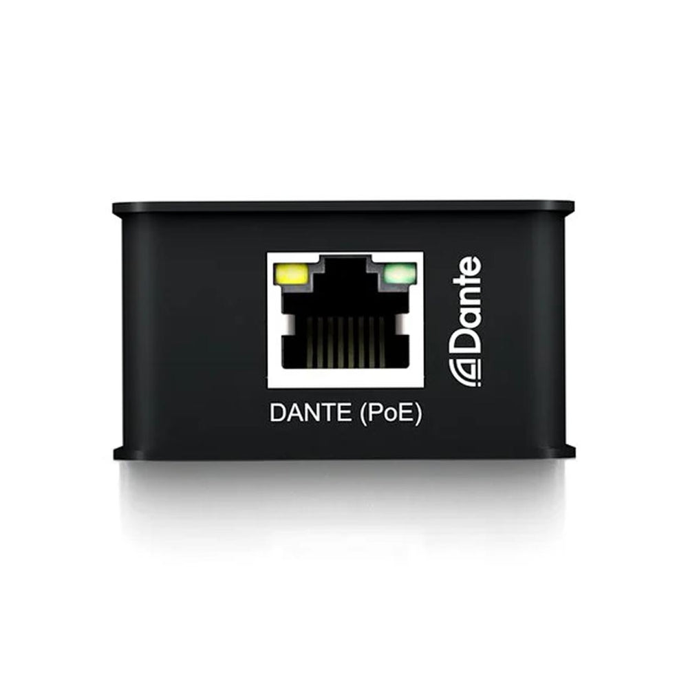 A 6-pin Phoenix connector for 2-channel balanced/unbalanced analogue audio input and a female RJ45 (100Mbps) for the Dante network.