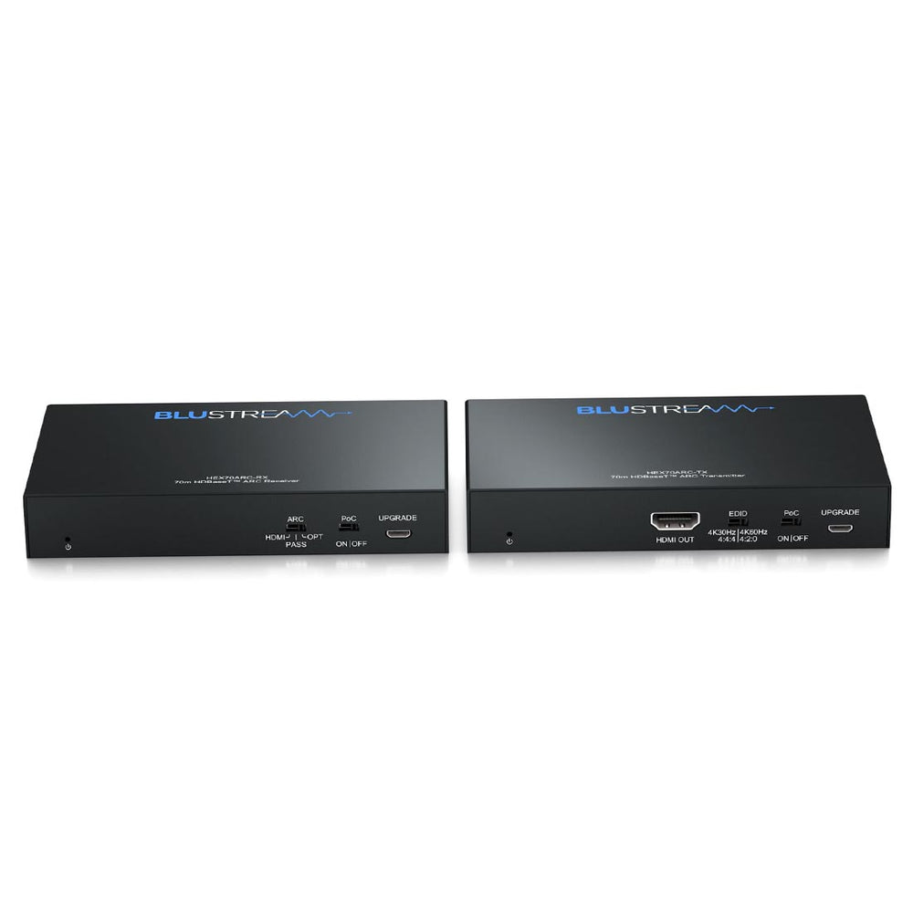 The Blustream HEX70ARC-KIT 4K HDBaseT™ ARC extender set delivers HDMI, ARC, Optical Audio Return, bi-directional IR, and bi-directional PoC over a single CAT cable. It provides uncompressed video and audio with zero latency for custom installations.