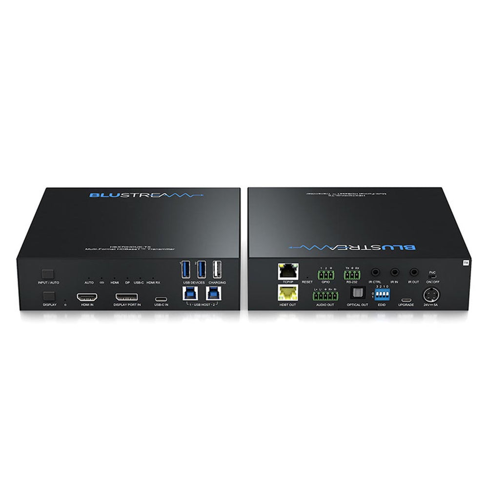 The Blusteram HEX70HDUK-KIT is a multi-format HDBaseT CSC extender set that delivers HDMI, USB‑C, and DisplayPort up to 40m (70m at 1080p) over a single CAT cable with HDMI2.0 4K 60Hz 4:4:4 (18Gbps) and HDCP2.2 support. It integrates USB 2.0 extension, a local HDMI input on the receiver, web-GUI control, auto display control, audio breakout, bi-directional IR pass-through, PoC, and advanced EDID/HDCP management.