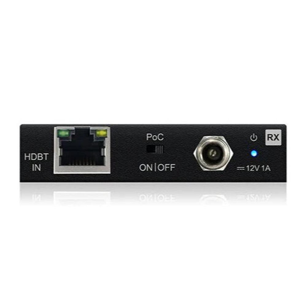 The receiver extends HDMI over a single CAT cable and supports 4K UHD within specified distances for reliable distribution.