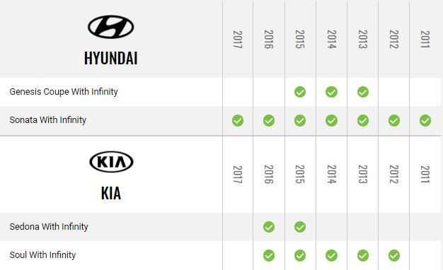 The HRN-AR-HK1 amplifier replacement harness is designed for use in select Hyundai and Kia vehicles with factory amplified audio systems such as Harman Kardon. It is compatible with a variety of models, including the 2011-2014 Hyundai Sonata, 2011-2014 Kia Optima, and 2011-2014 Kia Sorento. For a full list of compatible models, consult the product manual, or see chart below.