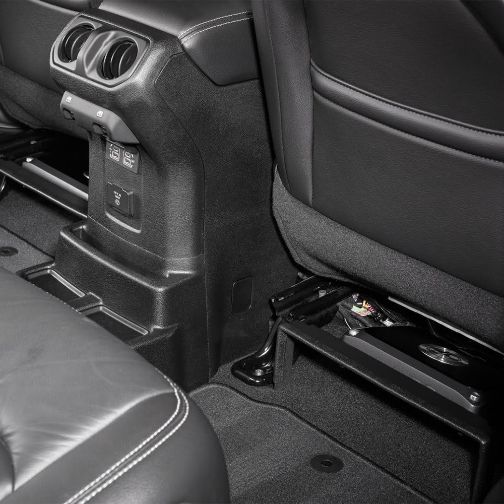 It securely mounts JL Audio amplifiers under the front seats of select Jeep Wrangler and Gladiator models.