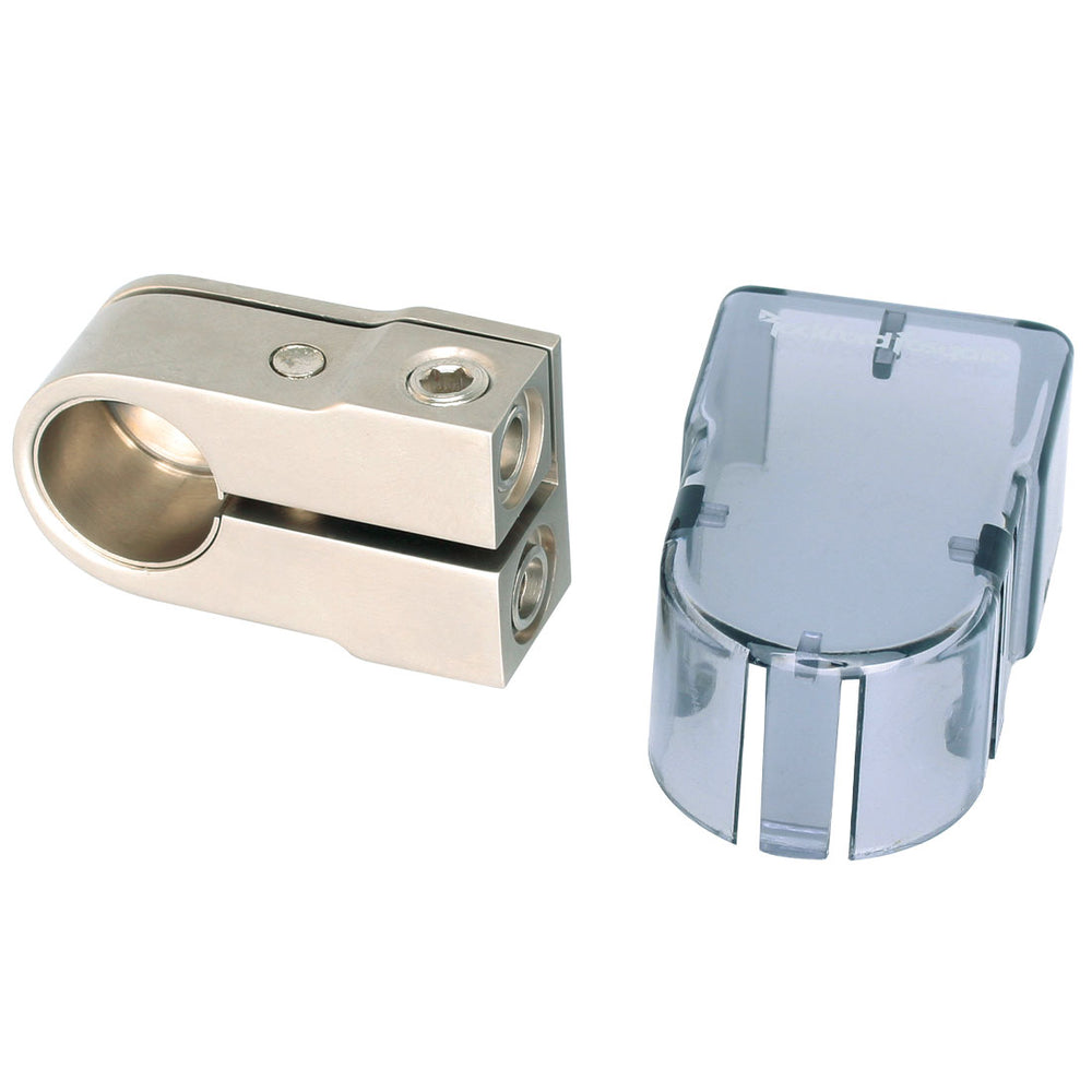 Platinum plated battery terminals allowing for both a positive or negative connection utilizing the supplied sizing ring. Terminals allow for multiple wire size inputs. Positive/Negative battery terminal, platinum finish. (2) 4 AWG/8 AWG inputs.