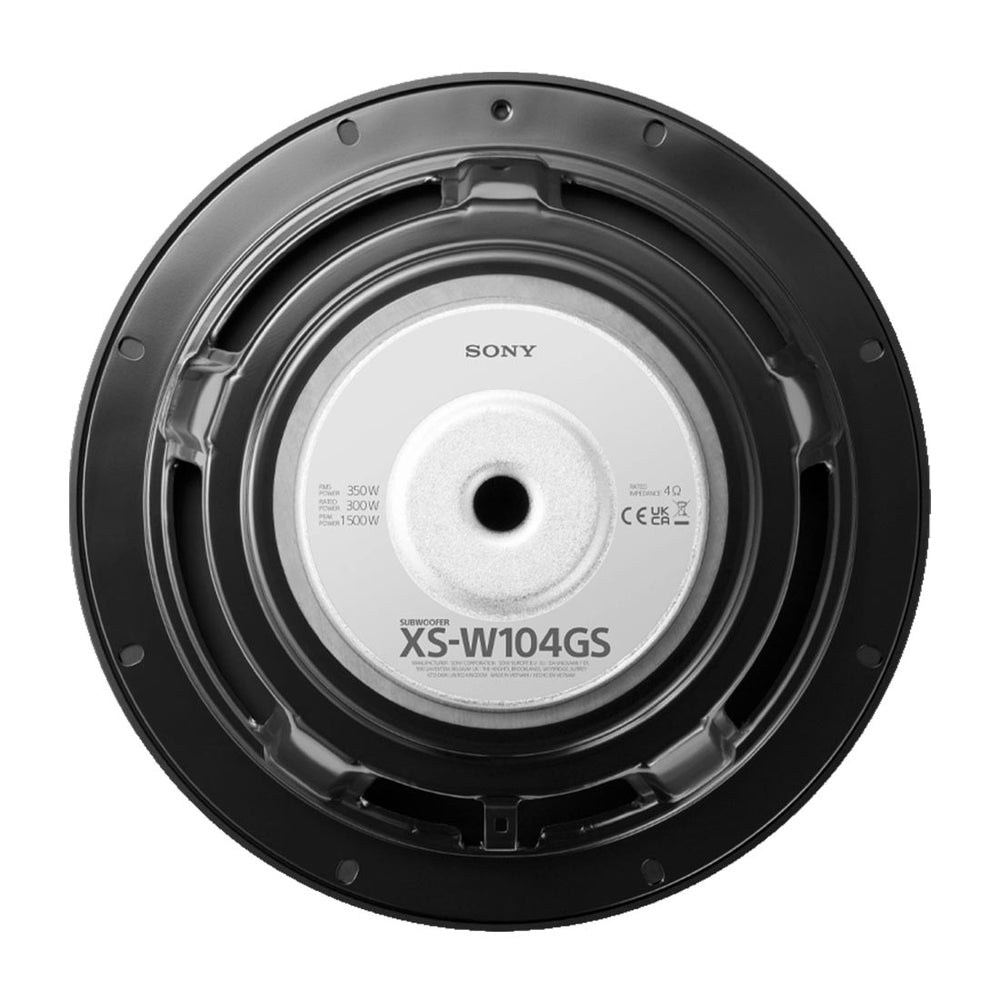 - How does the rubber surround in the XS-W104GS subwoofer contribute to its performance? The rubber surround reduces excessive vibration and supports cone excursion with minimal distortion, resulting in a solid bass response even at high volume levels.