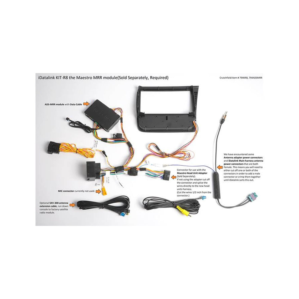 - What head units are compatible with the iDatalink Maestro KIT-R8? The kit works with any iDatalink-compatible double-DIN head unit. Check the iDatalink website or your head unit's specifications to ensure compatibility.