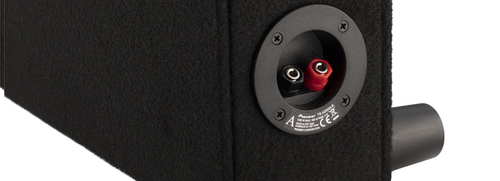 The enclosure houses a rugged Pioneer 10" sub, which features an oversized, injected polypropylene cone with a rubber surround to punch out deep bass with less distortion. Its dual-spider design helps to stabilize the cone and support the linear movement needed to pump out big volume. The rugged enclosure is built of 5/8" MDF for strength, and is covered in black carpet with an embroidered Pioneer logo. A steel mesh grille protects the speaker against all the dangers of life behind a seat.