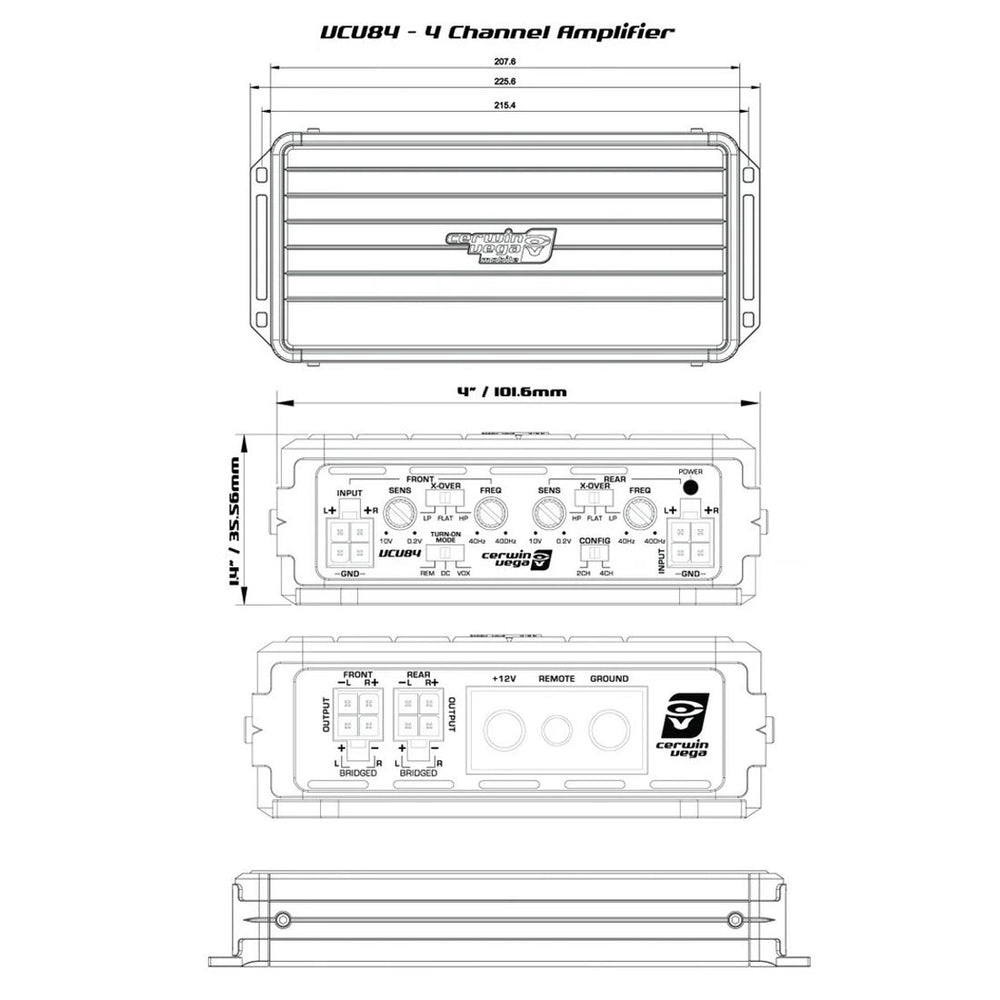 - What type of amplifier is the Cerwin Vega VCU84? It's a 4-channel full range Class D amplifier designed for powerful yet efficient performance.