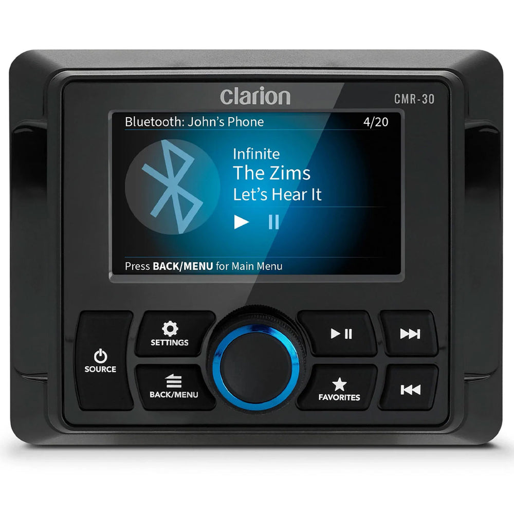 Marine Wired Remote with Full-Color LCD Display The rugged CMR-30 remote control keeps you in command of your boat's Clarion CMM stereo system. Use the backlit rubberized buttons to change sources, switch radio bands, adjust the volume, choose a track, toggle play/pause, and more. You can check out all your changes on the high-contrast 3" color LCD display.