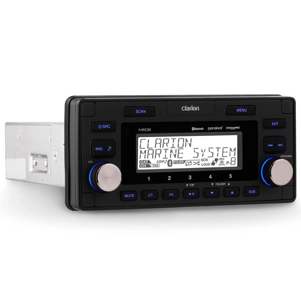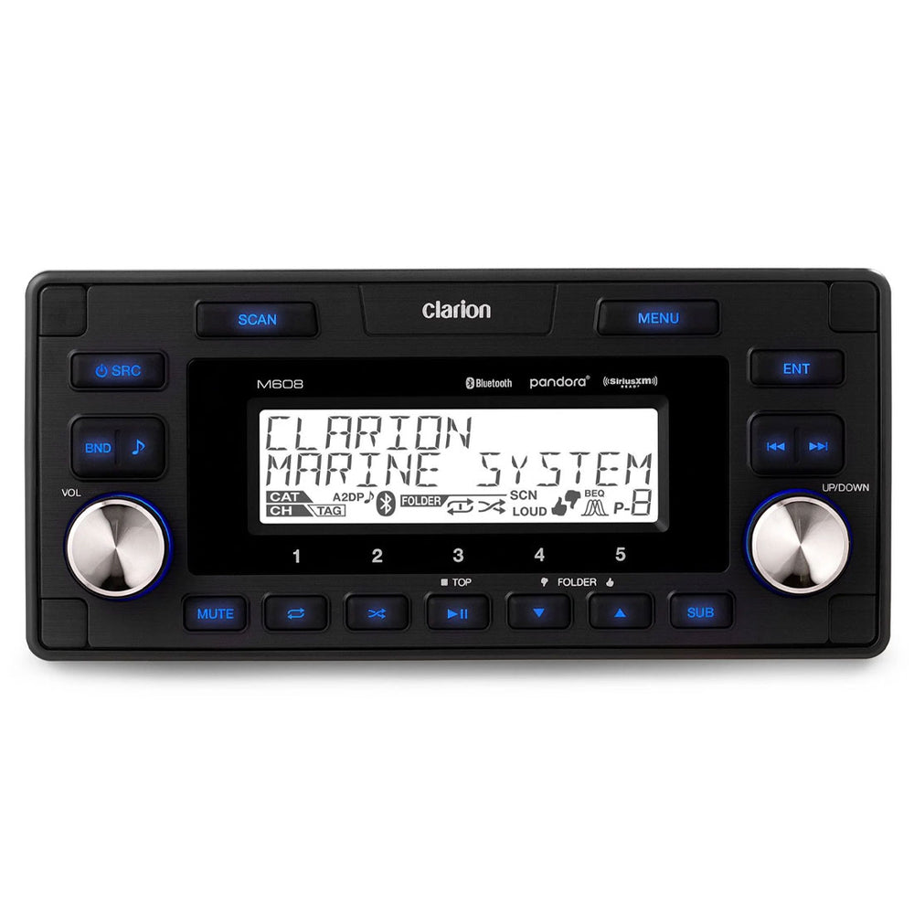 Digital Media Receiver with 4 Audio Zones Standard DIN chassis, oversized 1.5 DIN faceplate Features: AM/FM/WB, Bluetooth with AptX, USB, Aux Inputs (2), Pandora® and SiriusXM-ready, MFI for Apple iPod/iPhone USB Compatibility Receiver Water Resistant: IP55 front, IPX3 rear With its smooth styling, cutting-edge technology, and marine-rated toughness, Clarion's M608 digital media receiver is a great way to add sound and style to your boat. This powerful, versatile receiver includes built-in Bluetooth®, lots of connectivity options, eight preamp outputs and the security of IP55-certified water resistance.