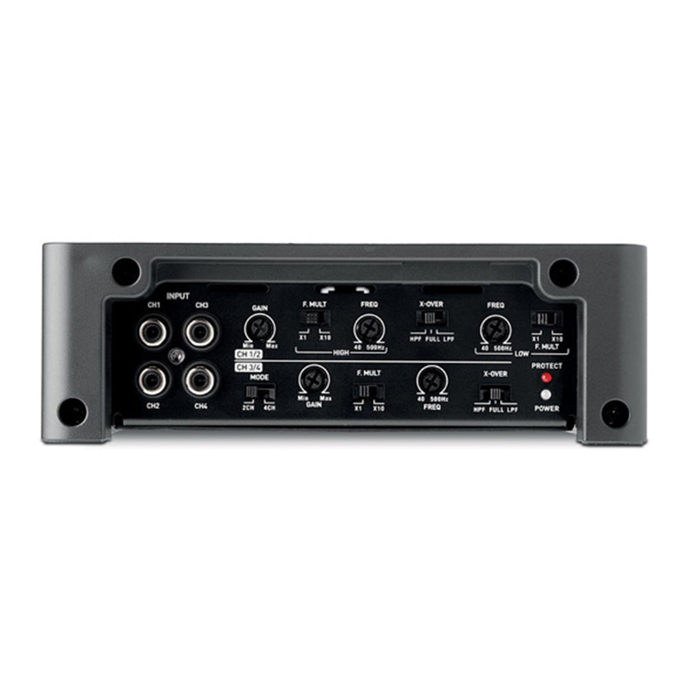 - Power Output: 4x70 watts RMS at 4 Ohms, 4x100 watts RMS at 2 Ohms, 2x200 watts RMS bridged at 4 Ohms