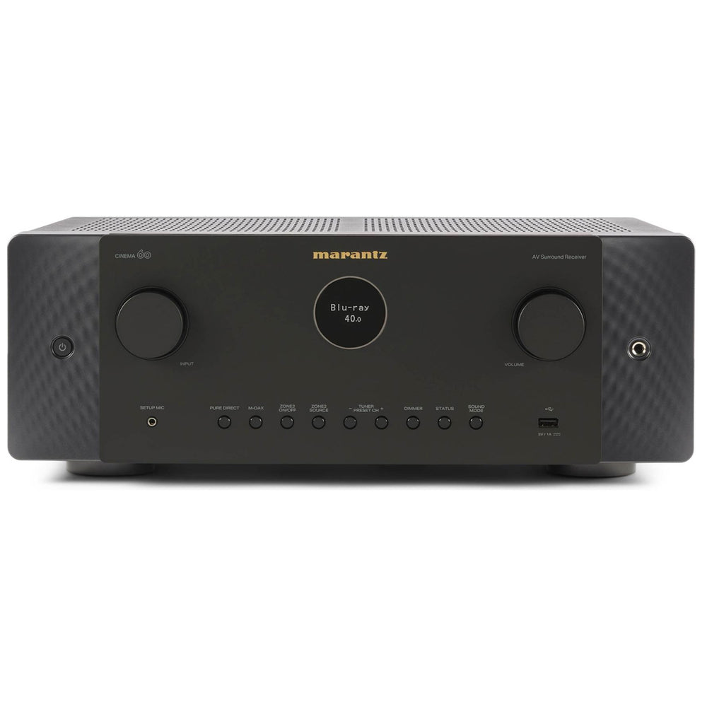 The Marantz Cinema 60 receiver, High-performance 7.2 channel AV receiver with 100 watts per channel amplification, Dolby Atmos, DTS:X, 8K Ultra HD, and HEOS built-in streaming. CINEMA 60 is the new standard of foundational luxury home theater.