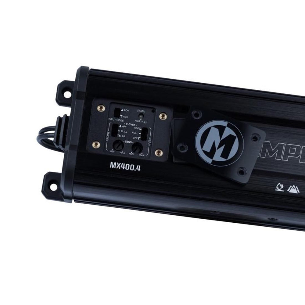Flexibility is key when it comes to integrating audio components into your powersports setup. The MX400.4 offers both high and low input options, as well as a convenient 2/4 input switch, ensuring seamless compatibility with a wide range of audio sources. Whether you're connecting to a factory head unit or an aftermarket receiver, this amplifier delivers unmatched versatility and performance.