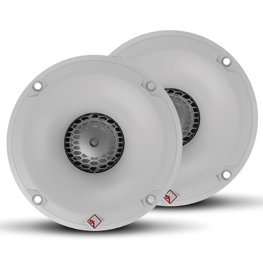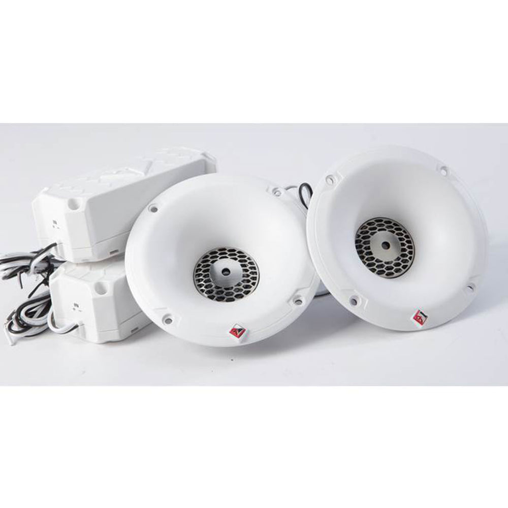 The Rockford Fosgate M2-TS allows the addition of component tweeters to any new or existing system. The Element Ready™ design is accomplished through the IPX6-rated front and grill and IPX5 frame. The UV Stable ASA plastic frame & grille design stand up to harsh marine environments, and the gold-plated marine-grade brass connection terminals provide a corrosion-resistant, maintenance-free connection. The crossover is a fully sealed external passive 18dB/octave Audiophile Grade high pass crossover utilizing metalized polyester film capacitors selected for their dependability, long life span, and preferred electrical characteristics. The kit includes a back-mount flush kit and a white horn-loaded mount bezel.