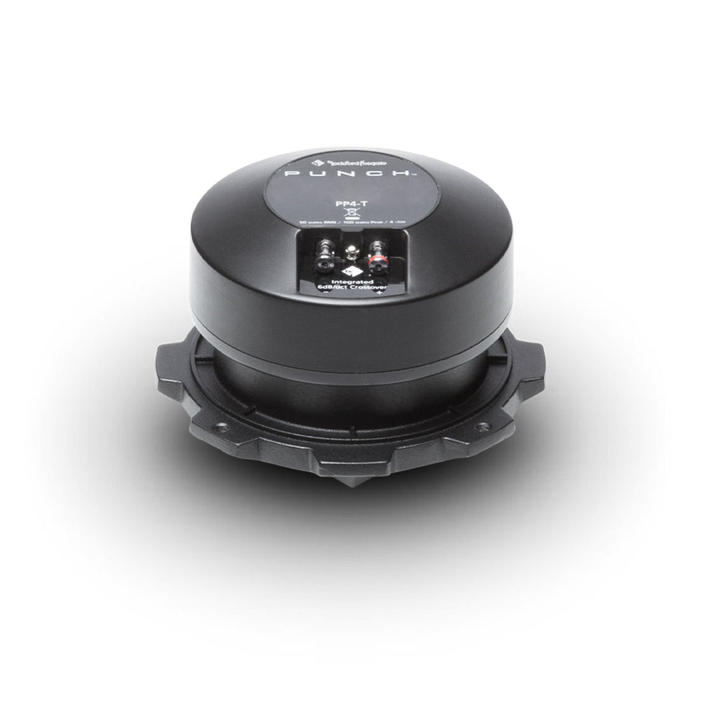 Rockford Fosgate knows that you like it loud, so they built a tweeter just for you. Using technology taken from concert sound systems, they built the Punch Pro PP4-T tweeter to take your system to the same kind of sound levels that you experience in your local clubs. This tweeter features an aluminum cone and phase plug that shrug off the heat, so it'll handle up to 50 watts RMS. The oversized motor structure and high-temperature voice coil help this tweeter cope with high volume levels, while its high sensitivity rating means you'll get maximum performance from your amp.
