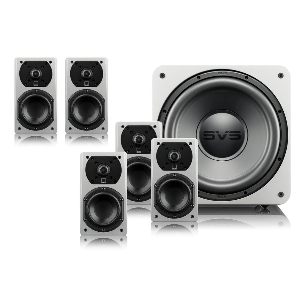 The SVS Prime Satellite 5.1 System includes five satellite speakers and the powerful SB-1000 Pro subwoofer, delivering immersive sound suitable for smaller spaces, with deep bass and clear highs.