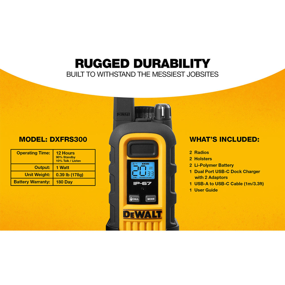 Unlike other radios that may require licenses or service fees, the DeWALT DXFRS800 is ready to use right out of the box, saving you time and money. You can start communicating with your team immediately, without any extra costs.
