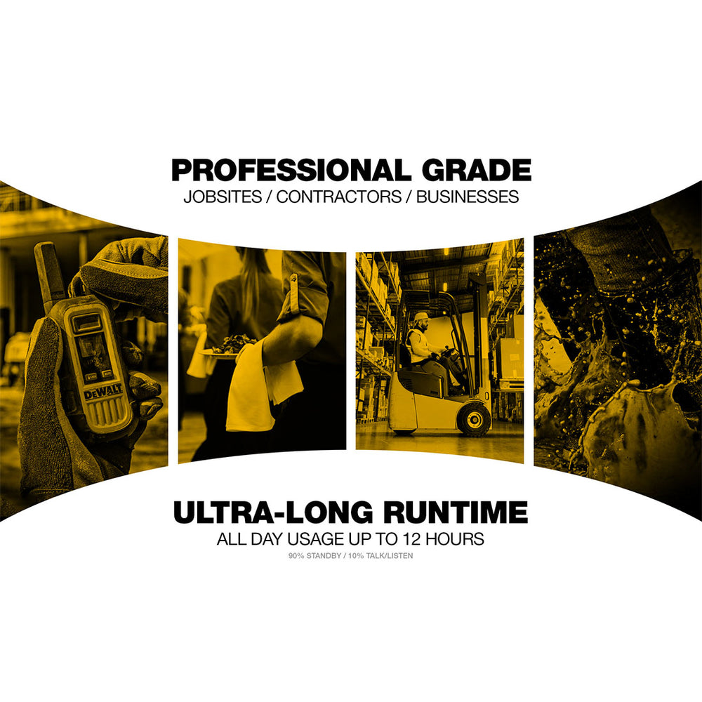 The DeWALT DXFRS800 is designed for long shifts with an impressive battery life. You can expect up to 18 hours of continuous use, with 90% of that time spent in standby mode, and the remaining time used for talking or listening. This extended runtime ensures that your radios stay active throughout your workday, keeping you connected without frequent recharges.
