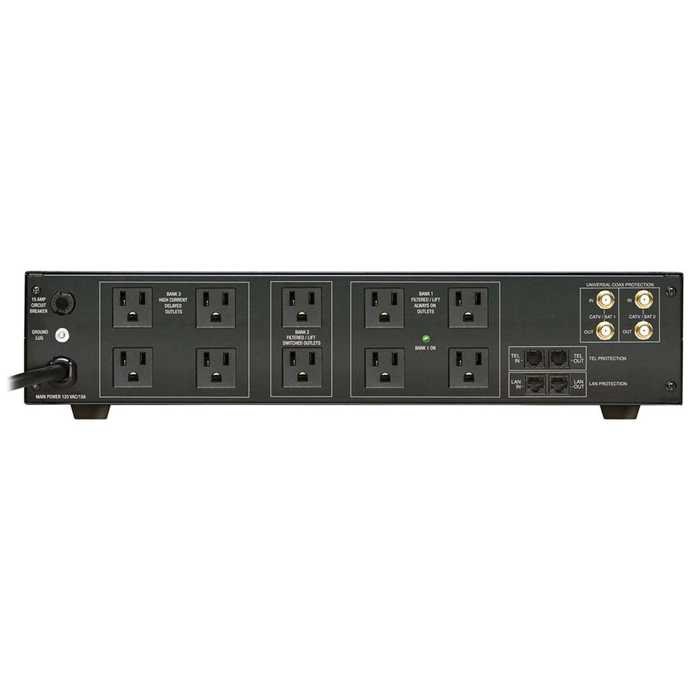 The ten rear-panel AC outlets are divided into three isolated banks to reduce inter-component interference and noise contamination. Four of the outlets accommodate high-current components like an amplifier and powered subwoofer. These switched outlets operate on a delay to prevent "speaker thump" when powering your system on and off.