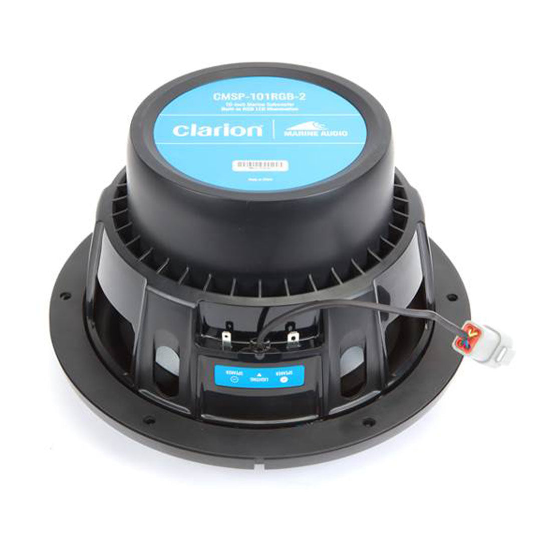 The Clarion CMSP-101RGB Premium Series 10" marine subwoofer is made to kick out the jams while handling the demands of the marine environment. Its injection molded polypropylene cone is UV-protected to stand up to hours baking in the sun, and the Santoprene rubber surround and marine-grade synthetic spider keep the cone under control for tight bass response. This sub will handle up to 250 watts RMS, and its impedance lets you draw maximum power from your mono sub amplifier. It's engineered to meet stringent standards for UV exposure and salt fog so you know it'll hold up in your boat, while waterproof speaker and LED lighting connectors help keep moisture out.