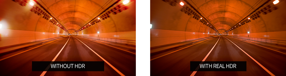 HDR (High Dynamic Range) is a technology that expands the range of brightness from the brightest to the darkest, as close as possible to what the human eye sees. For example, applying HDR when passing through a dark tunnel adjusts the light reflections in the tunnel to bring colour to life. When passing through a dazzling road, the sunglight in properly adjusted to make things look sharp.