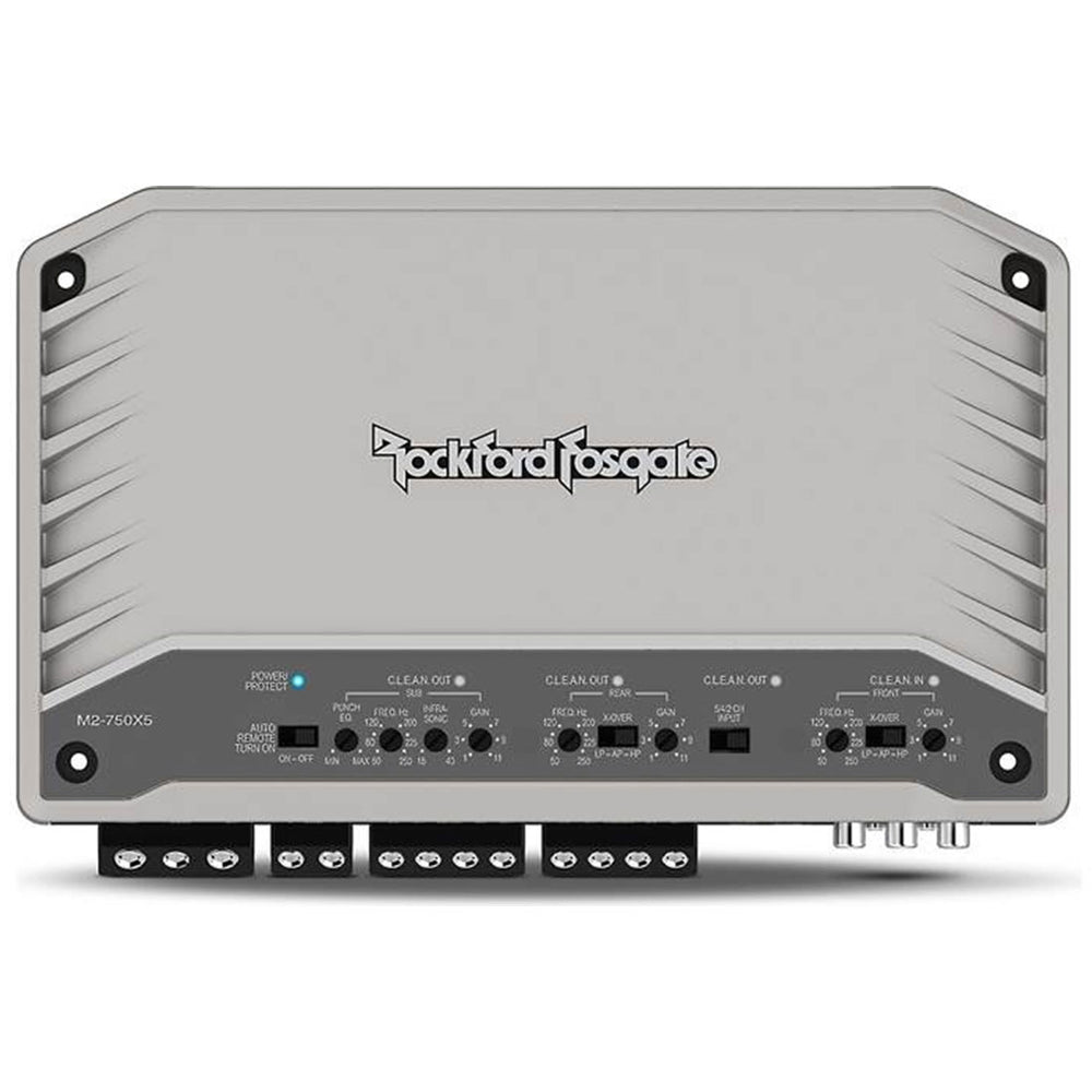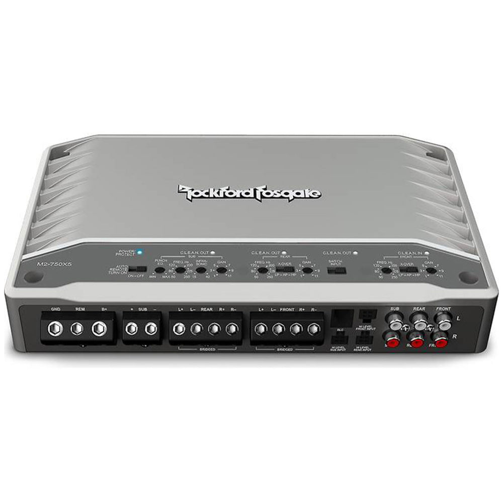 The Rockford Fosgate M2-750X5 amplifier is an Element Ready™ 750-watt, full-range class-D model, capable of operating at 4? or 2? stereo, and 4? bridged/mono with a subwoofer channels that can be run at 4? or 2? and is designed to withstand the elements. This amplifier is quite efficient due to its class D technology which reduces demand on the electrical system. The amp also features C.L.E.A.N. circuitry to help you adjust your gain settings, a P.O.W.E.R. Supply that generates more power as voltage increases, and integrated Punch EQ that corrects for acoustic deficiencies while delivering up to 3X the bass.