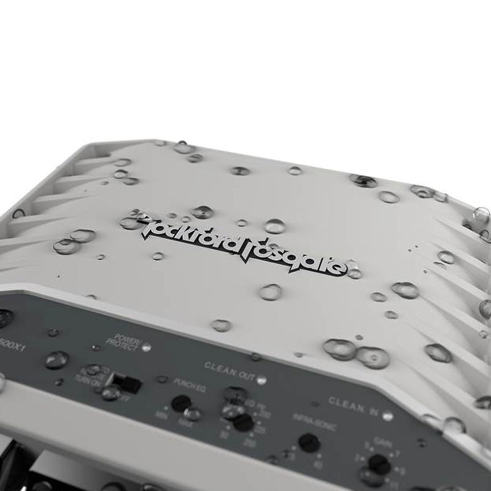 Rockford Fosgate designed this M2 Series amplifier for marine environments, using a special "Element Ready" chassis and conformal-coated PC boards to protect against dust and water. The amp also features a UV-stable powder-coated cast-aluminum heatsink and zinc nickel-plated marine-grade brass connection terminals to help prevent corrosion.