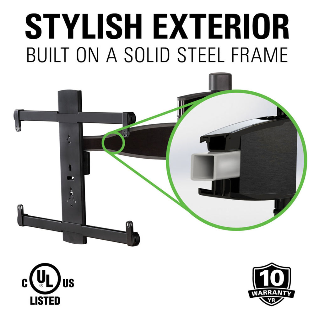 Behind the scenes, it’s not just a pretty face. This full-motion mount packs an ultra-strong steel frame under that stylish exterior, giving you serious strength and support. And with FluidMotion™ engineering, extending, swiveling, or tilting your screen feels smooth and effortless, no matter the TV's size or weight.