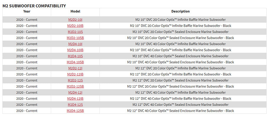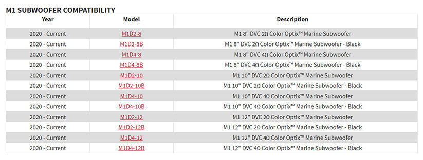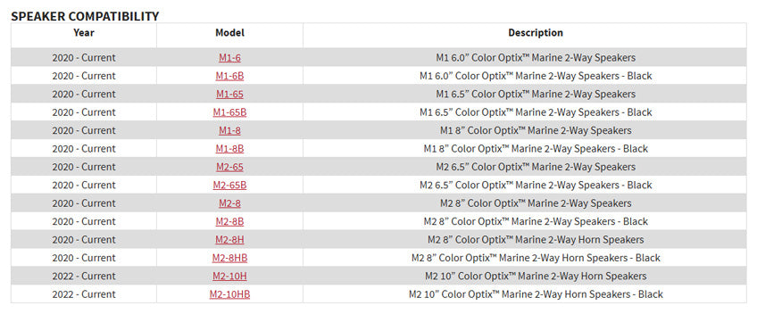 This cable works within the True Marine ecosystem alongside the Color Optix controller and matching speakers or subwoofers. It is compatible with Rockford Fosgate M1/M2 speakers and subwoofers; check the compatibility chart below before purchasing.