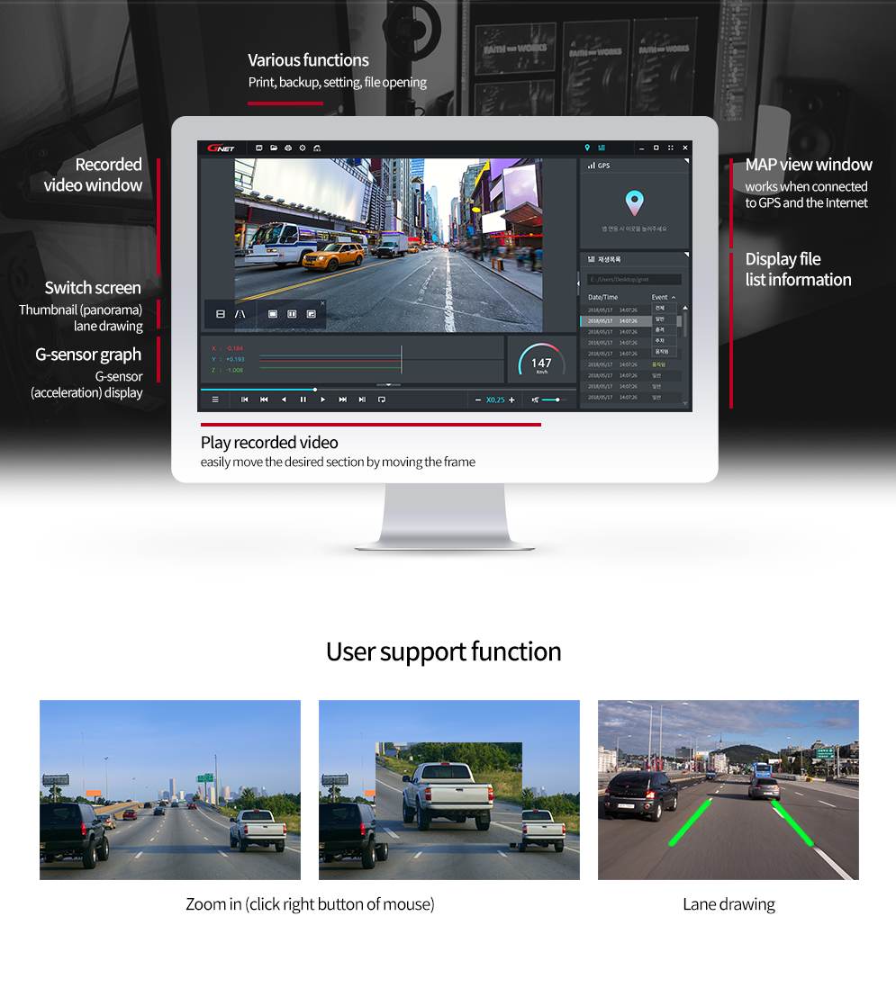 The G-ONX offers seamless playback and analysis of your recorded videos through the GNET PC VIEWER. It includes various functions like zoom, partial zoom, lane drawing, and frame settings. Additionally, you can generate AVI or MP4 files, protect against tampering, view thumbnails, and perform interval repetitive searches. It's a comprehensive tool that puts you in control of your recorded footage.