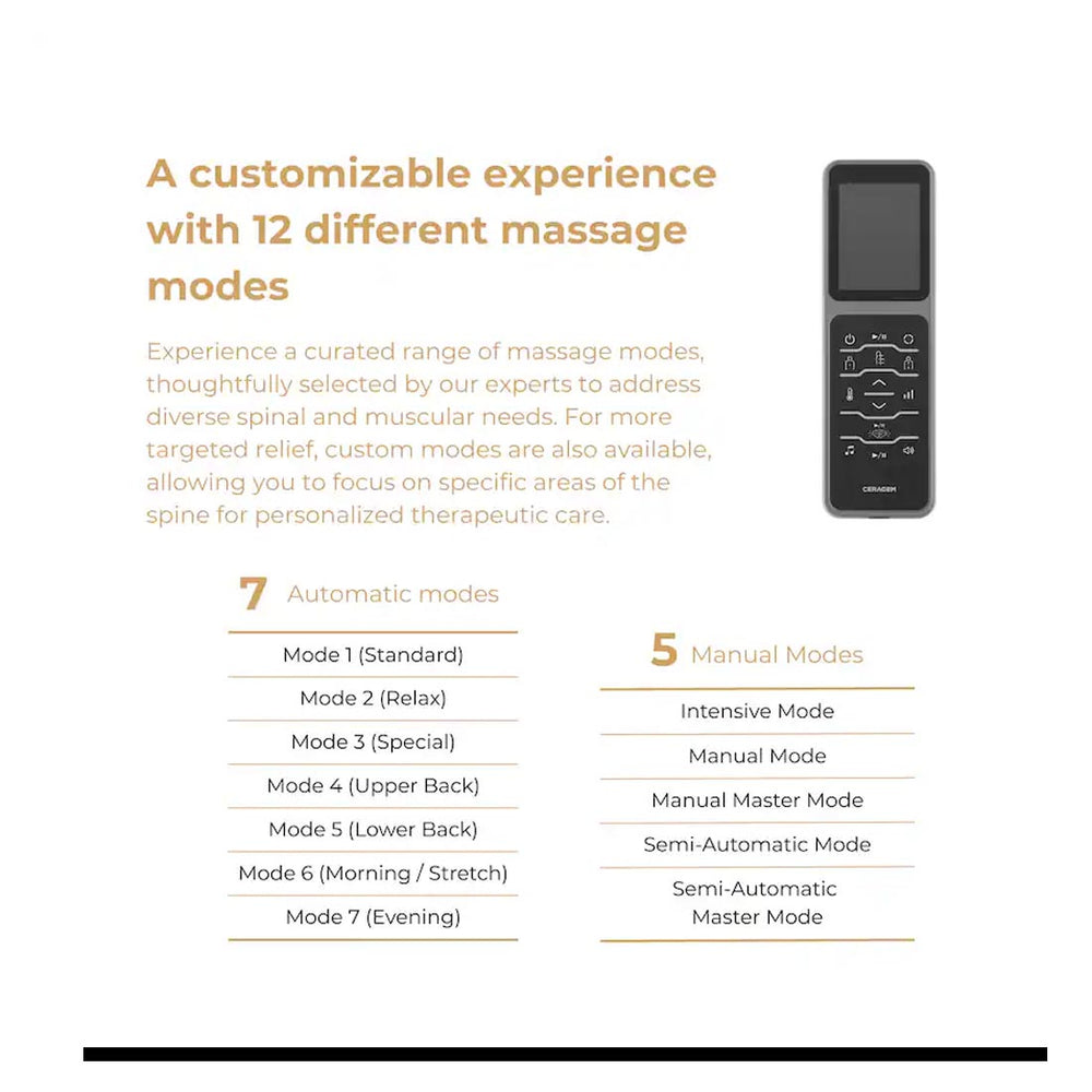 There are 12 total modes: 7 Auto Massage Modes (including upper/lower back, morning stretch, and nighttime relief) and 5 Manual Modes with spinal segment targeting.