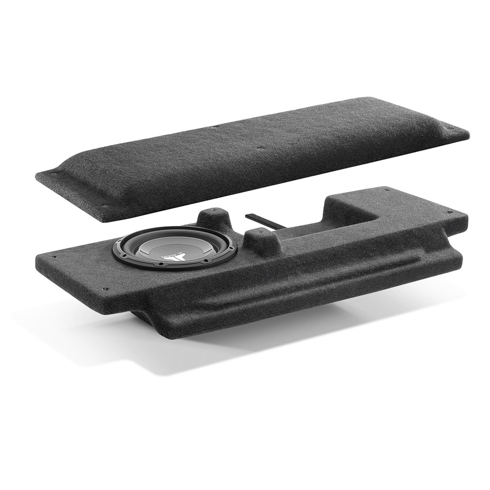 This low-profile Stealthbox® system sits inconspicuously on the cargo-area floor and features a rigid, carpet-covered, removable panel that conceals a powerful 10-inch subwoofer driver and a secure mounting place for a JL Audio amplifier (sold separately).