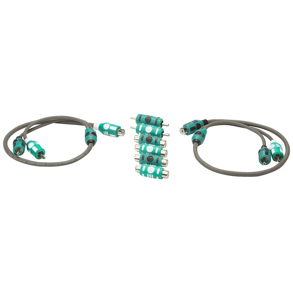 These marine-grade RCA cables are built to perform in the demanding conditions of your boat. The package includes two Y-cables (1 female to 2 male) and six adapters (4 female-to-female and 2 male-to-male).