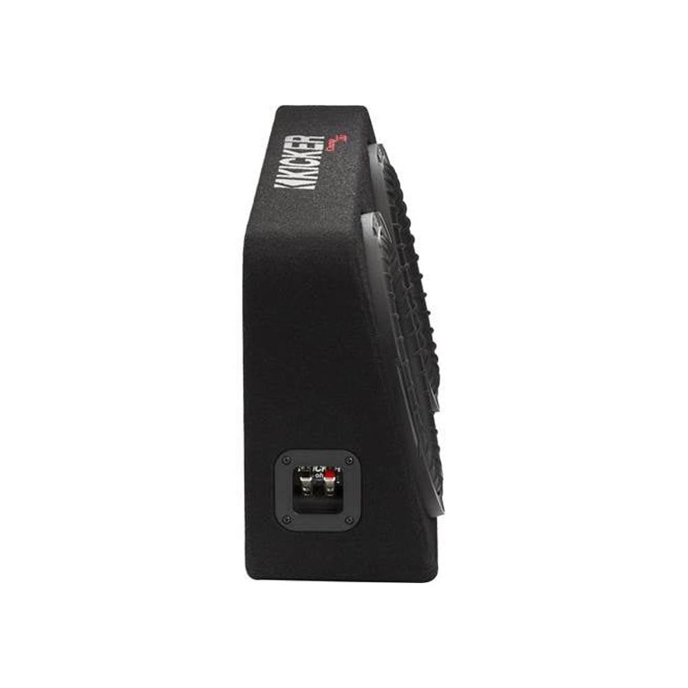 The 48TCWRT102 loaded enclosure from Kicker is specifically designed to house this low-profile 10" CompRT subwoofer and a second passive sub. The compact box is engineered to fit into the crowded spaces of today's cars and trucks, delivering Kicker's renowned bass power. The sealed box ensures maximum performance, and the passive radiator reacts to the air pressure produced by the active sub, reinforcing the low-end frequencies without the noise associated with ported enclosures.