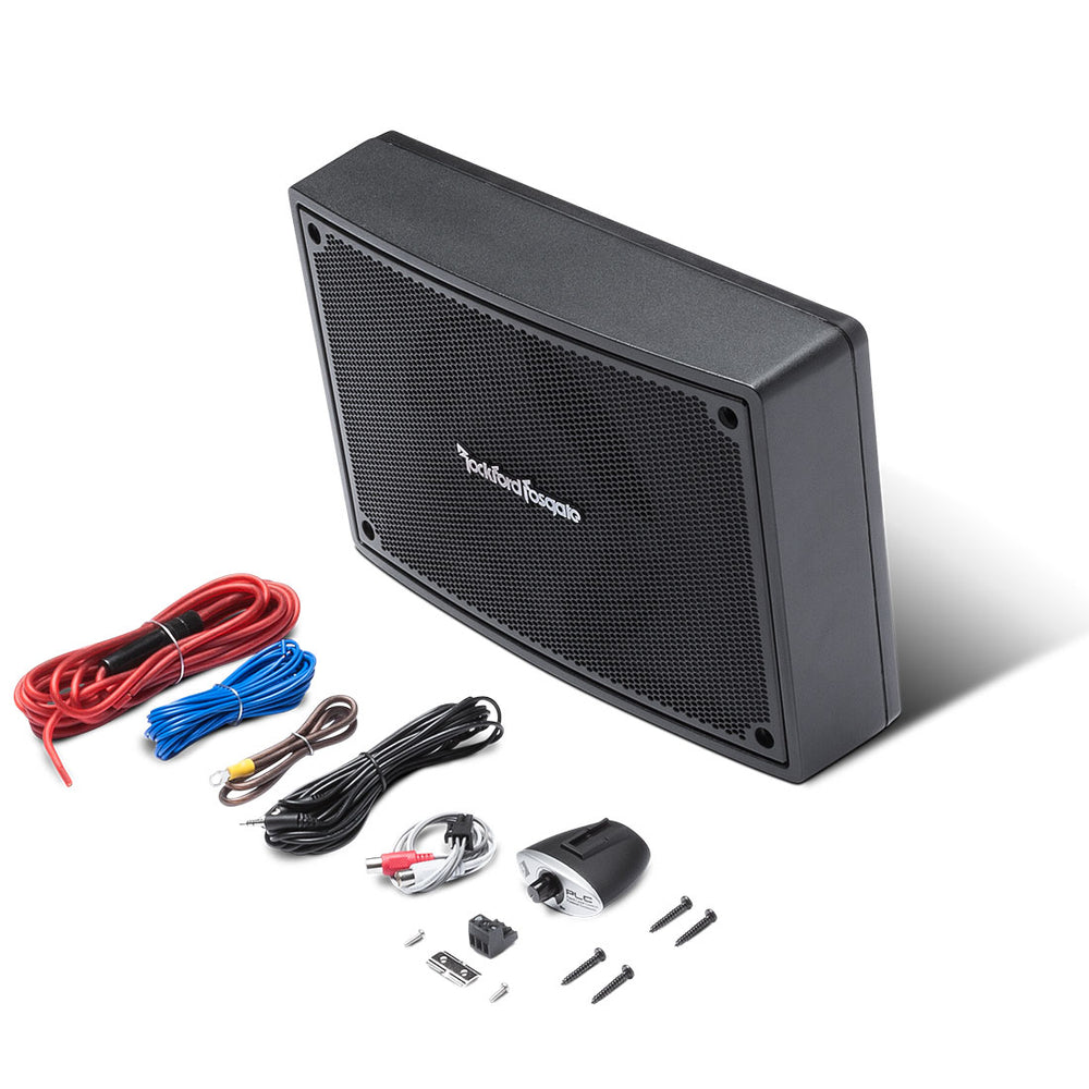 The Rockford Fosgate PS-8 is a self-contained amplified subwoofer system featuring a single Punch 8" driver in a sealed enclosure and a built-in 150-watt amplifier. If you need to quickly add bass to a system but don't have much space or height to make it happen? Then the Rockford Fosgate PS-8 is a perfect candidate! The PS-8 features a Punch 8” subwoofer in a custom-sealed enclosure and is powered by a mighty 150-watt amplifier. The system is all-inclusive, so you only need to run power, ground, and a signal from the source to get this baby moving. Features a durable exterior that resists scrapes and bumps while in the trunk or cargo area.