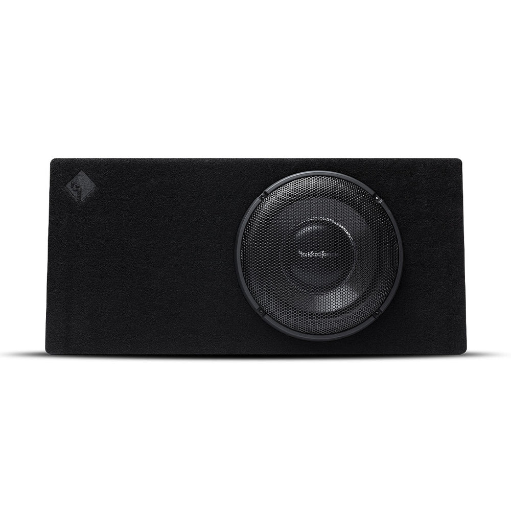 Need a slim subwoofer system to fit behind your truck seat, but has high power handling? Rockford Fosgate has the solution to your problem with the Power T1 slim 12” sealed loaded enclosure. It may look small, but it plays loud thanks to its whopping 600-watt RMS power handling capacity, and since it’s prewired to 1-Ohm, you can push it with some serious power. Features space-saving, slim-line wedge design, premium carpet with stitched Rockford Fosgate logo, and quick-release input terminals.