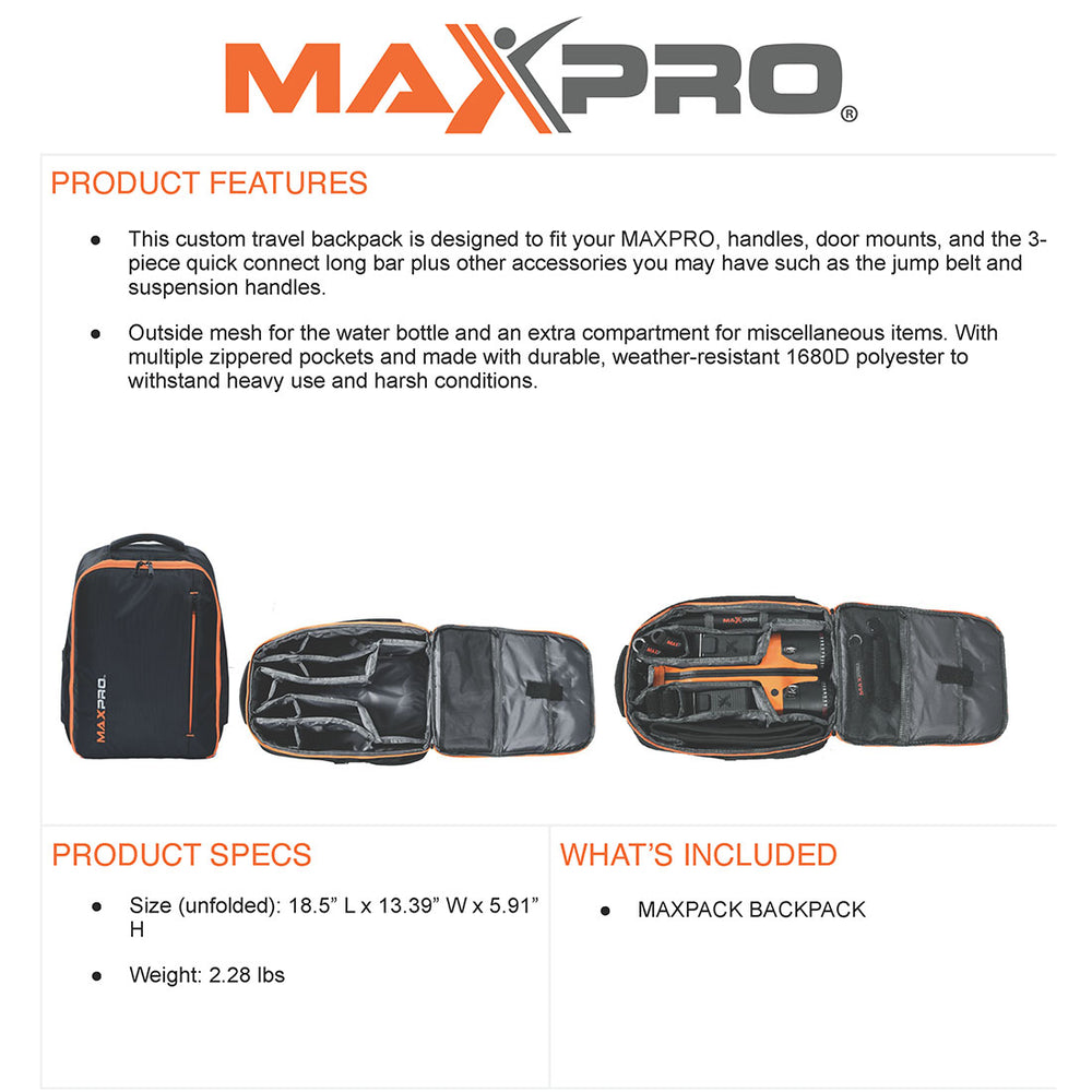 The MAXPRO X2001 MaxPack Backpack is custom-made to fit your MAXPRO equipment like a glove. With enough room to hold your MAXPRO, handles, door mounts, and even the 3-piece quick-connect long bar, this backpack ensures that everything has its place. Got other accessories like the jump belt or suspension handles? No problem! There’s ample space to store all your workout essentials in one convenient spot.